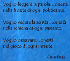 Vedo con piacere, che sei persona limpida, e onesta. Il fatto è, che le persone oneste, delle quali la televisione e i giornali non parlano quasi mai, sono in realtà, coloro che permettono la sopravvivenza del Mondo, perché qualora non ci fosse più sulla terra nemmeno un giusto (o onesto, o santo...), Dio distruggerebbe la stessa Terra.