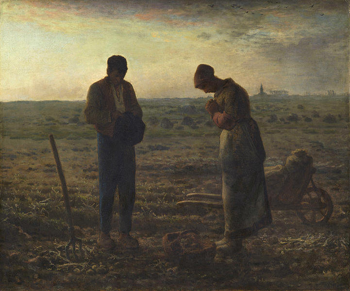 | 1 Jean Francois Millet, Ángelus, Museo de Orsay, 1857-1859 Olio su tela, 55.5 x 66 cm. I due contadini in preghiera hanno appena cessato la raccolta delle patate, che riprenderà appena terminata l'orazione. Millet racconta così la genesi di questa sua opera : "L'Angelus è un quadro che ho dipinto ricordando i tempi in cui lavoravamo nei campi e mia nonna, ogni volta che sentiva il rintocco della campana, ci faceva smettere per recitare l'angelus in memoria dei poveri defunti" . | 2 Fernando Amorsolo (1892-1972) Angelus, Secolo XX° , riprende il tema di Millet; la raccolta delle patate è già terminata, perché intorno vi è erba molto alta e ancora verdeggiante; perciò non può trattarsi di un campo di patate, dove l'erba tende ad essere rara e appassita dall'autunno; i tuberi, sistemati che sono sul piccolo carro senza ruote, sono trainate da una bufala; perciò la sosta della preghiera, è sopra le patate sul carro e lungo il percorso verso casa. Finita la preghiera, ripiglia il viaggio. |